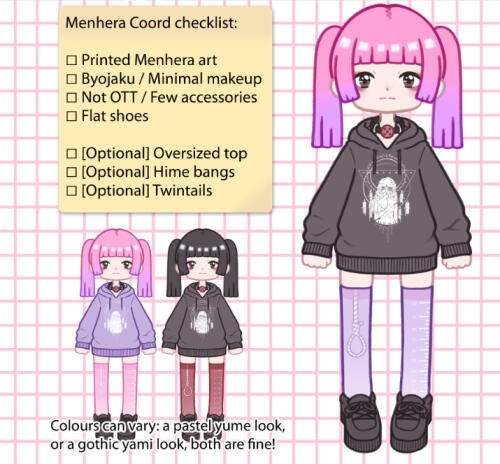 Menhera fashion is comfortable fashion that has a theme of mental health, featuring some kind of vent print. While the guidelines are loose, note that wearing anything triggering in public or overly costumey is discouraged in menhera fashion.